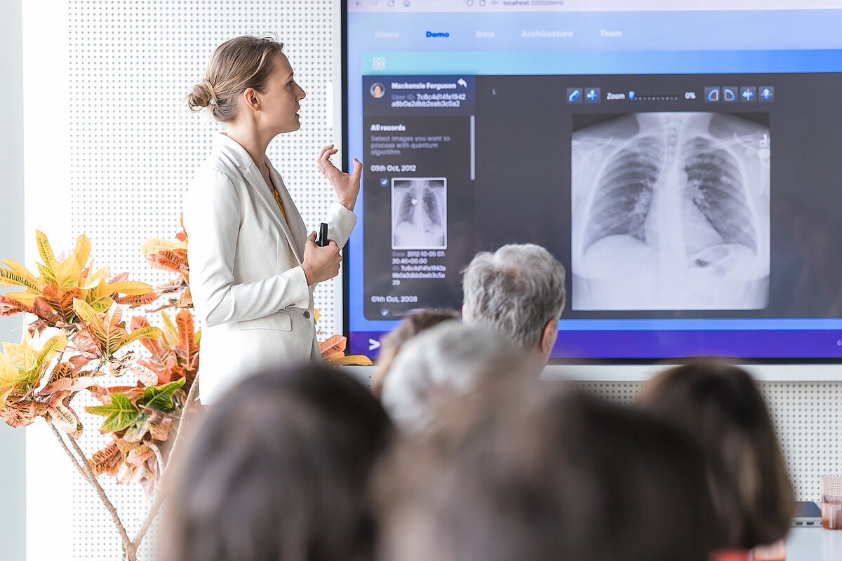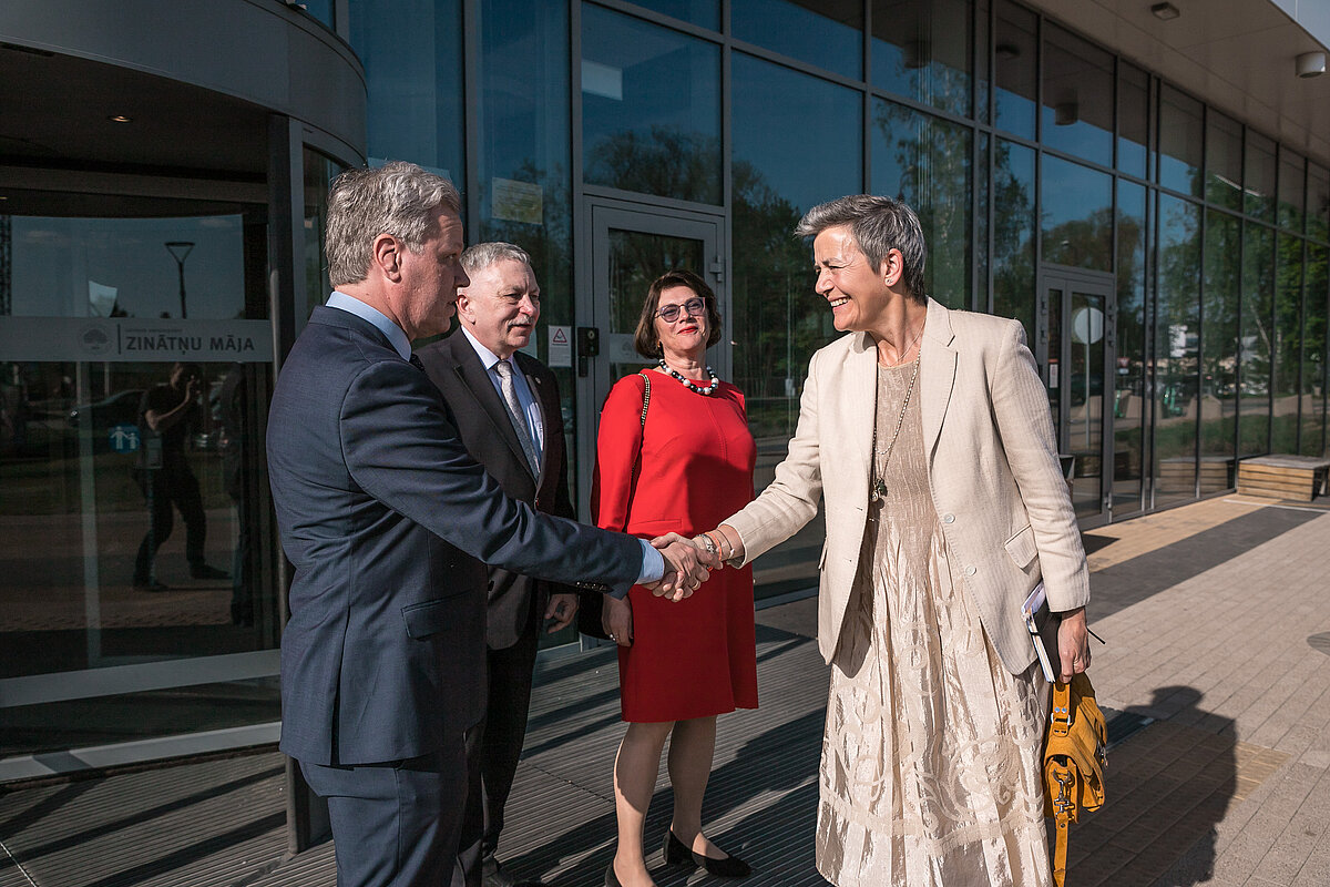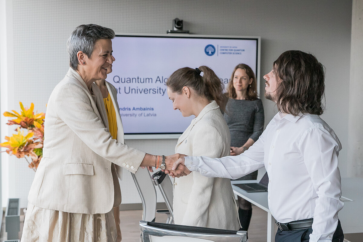 The meeting with Margrethe Vestager, the Executive Vice-President of the European Commission, occurred in the House of Science of the Academic Centre of the UL. Margrethe Vestager was acquainted with the new Academic Centre of the University of Latvia and its development by Prof. Indriķis Muižnieks, the Rector of the UL, and Signe Bāliņa, the Rector's Advisor for Digital Society of the UL. Prof. Andris Ambainis, the Head of the Centre for Quantum Computer Science of the Faculty of Computing (FC) of the University of Latvia, and Maksims Dimitrijevs, the researcher at the Centre of Quantum Computer Science, introduced to research in the field of quantum algorithms and demonstrated a quantum algorithm that can be run on a quantum computer. Whereas Gunta Kunakova, the leading researcher at the Institute of Chemical Physics of the UL, presented the Latvian Quantum Initiative and Zane Kalniņa, Accenture Baltics Applied Quantum R&D Project Lead, talked about the joint research of the UL and the company Accenture in using quantum algorithms to analyze radiological images.