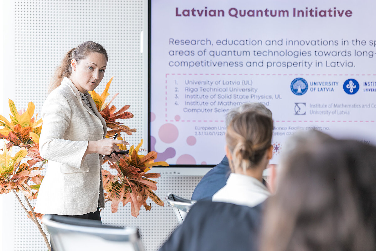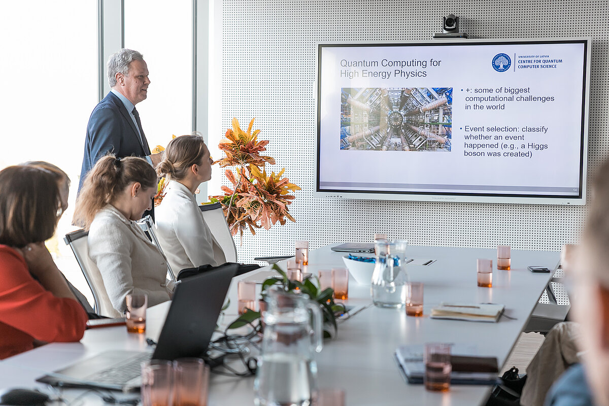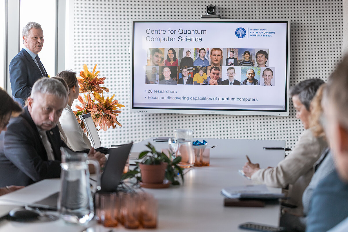 The meeting was also attended by Zane Petre, the Head of the European Commission's Representation in Latvia, prof. Valdis Segliņš, LU Vice-Rector in Natural Sciences, Technology and Medicine, Aleksandrs Belovs and Mārtiņš Kālis, researchers in the Centre for Quantum Computer Science.